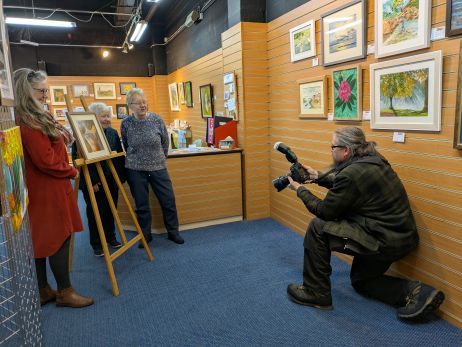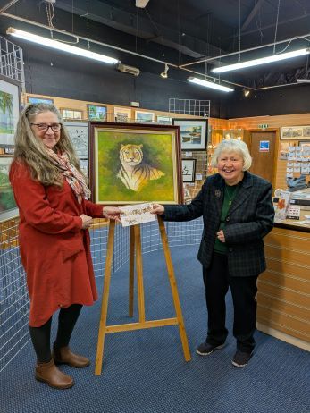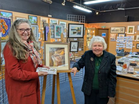 Dunfermline Art Club is delighted to award the “George Aitken Award” to Fiona Beveridge for her pastel study “Orange Glow”, posted here. Visitors were invited to vote for their favourite picture from the exhibition, and “Orange Glow” won with the most votes. Over 300 votes were cast, demonstrating the popularity of our Autumn Exhibition. Below you can see Nancy Aitken awarding Fiona Beveridge her prize, with George Aitken’s painting in the background. The press arrived to take a photo of our presentation which made it into the Dunfermline Press, and a full report can be found on our Exhibition page.