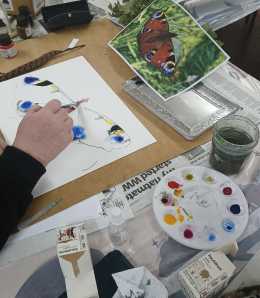 Each placement had paper of various sizes and weights, with fine writer ink pens, traditional ink pens with nibs, a feather quill, piece of card and a wooden stick. Hayley then explained and demonstrated the effects of each instrument, including how to prepare the feather quill, the properties of waterproof ink, its pigment and how that varied to watercolours. She also practically demonstrated wet- on- dry and wet- on- wet techniques and the use of dabbing with paper towels and showed examples of her work for each on the various supports.